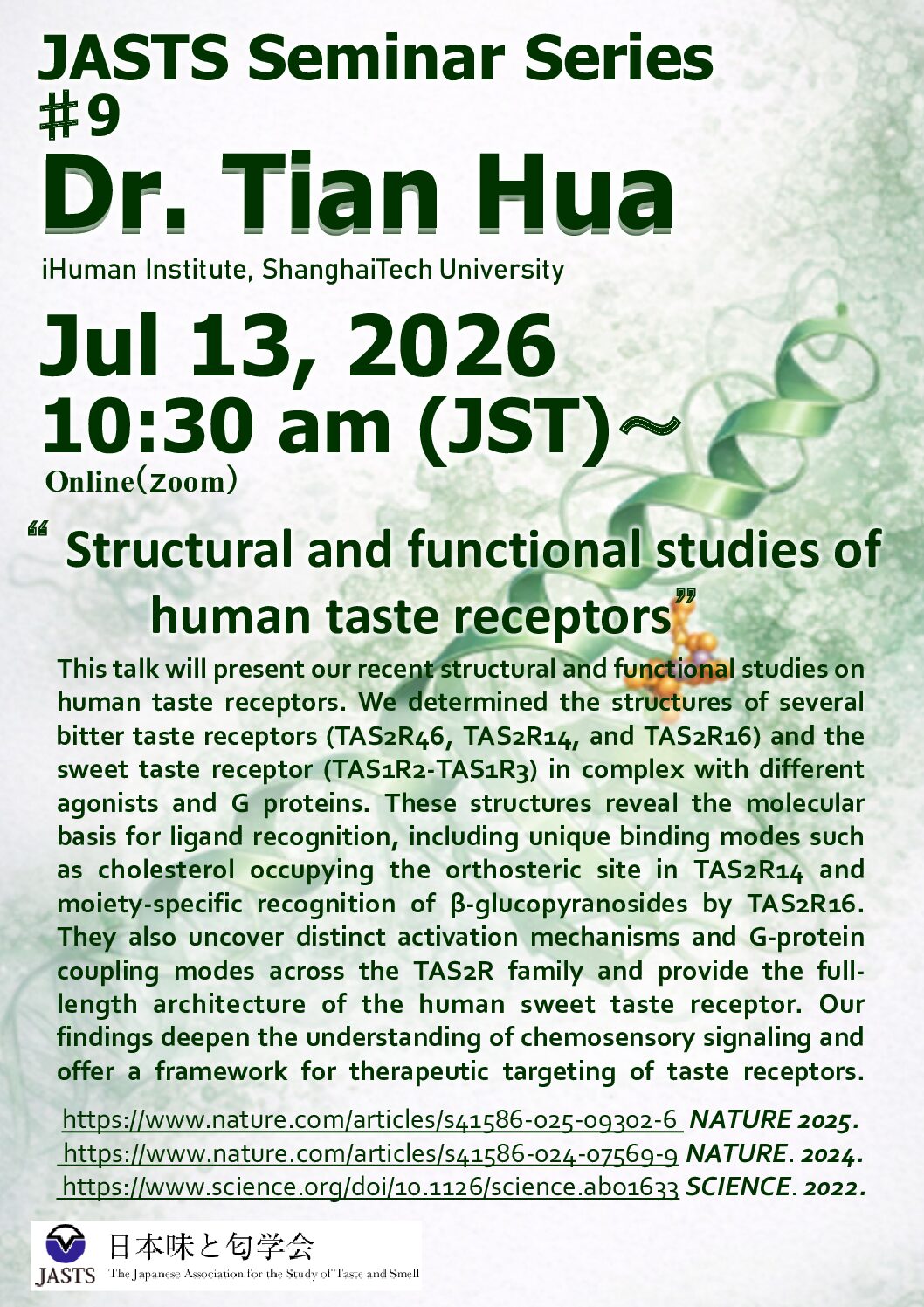 日本味と匂学会(JASTS)では、嗅覚・味覚研究のトップランナーにオンラインで講演をいただくJASTS Seminar Seriesを開催しております。